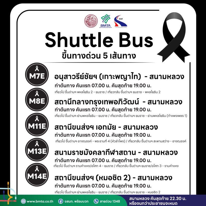 ตามที่กระทรวงคมนาคมได้กำชับให้ทุกหน่วยงานในสังกัดร่วมดำเนินการอำนวยความสะดวก แก่ประชาชนที่จะเดินทางไปถวายสักการะพระบรมศพ ณ พระที่นั่งดุสิตมหาปราสาท ให้เป็นไปด้วย ความเรียบร้อยและสมพระเกียรติ ขสมก. ได้ดำเนินการจัดแผนรองรับการเดินทางของประชาชน ด้วยรถ Shuttle Bus เชื่อมต่อสถานีรถไฟฟ้า ท่าเรือ และสถานีขนส่งผู้โดยสารทั่วกรุงเทพ เพื่อให้ประชาชนสามารถเดินทางสู่ท้องสนามหลวงได้อย่างสะดวกและปลอดภัย รวมจำนวน 15 เส้นทาง