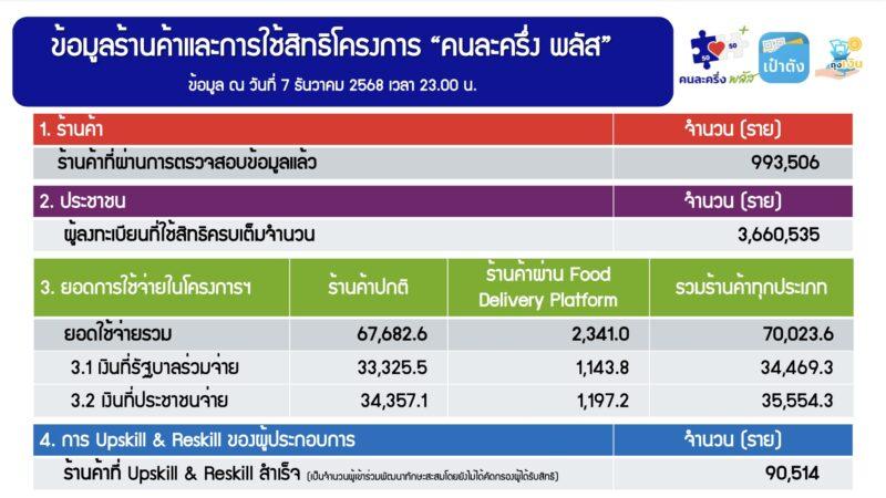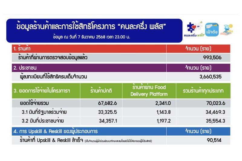 คนละครึ่งพลัสถึง 7 ธ.ค.68 เงินสะพัด 7 หมื่นล้านบาท ใช้สิทธิหมดแล้ว 3.6 ล้านราย ร้านค้าอัพสกิลพุ่ง 9 หมื่นราย