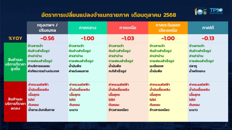 วันที่ 5 พฤศจิกายน 2568 นายนันทพงษ์ จิระเลิศพงษ์ ผู้อำนวยการสำนักงานนโยบายและยุทธศาสตร์การค้า เผยว่า ดัชนีราคาผู้บริโภคทั่วไปของไทย เดือนตุลาคม 2568 เท่ากับ 100.00 เมื่อเทียบกับเดือนตุลาคม 2567 ซึ่งเท่ากับ 100.77 ทำให้อัตราเงินเฟ้อทั่วไปลดลงร้อยละ 0.76 (YoY) โดยปัจจัยหลักมาจากมาตรการลดภาระค่าครองชีพให้กับประชาชนของภาครัฐ ผ่านโครงการ Quick Big Win และสถานการณ์ราคาพลังงานในตลาดโลก ส่งผลให้ราคาสินค้าในกลุ่มพลังงานลดลงทั้งค่ากระแสไฟฟ้าและน้ำมันเชื้อเพลิง นอกจากนี้ มีสินค้าสำคัญที่ราคาลดลง ได้แก่ เนื้อสุกร ไข่ไก่ ผักสด และผลไม้สด จากปริมาณผลผลิตที่เพิ่มมากขึ้น รวมทั้งของใช้ส่วนบุคคล จากการส่งเสริมการขายของผู้ประกอบการ สำหรับราคาสินค้าและบริการอื่นๆส่งผลกระทบต่อภาวะเงินเฟ้อไม่มากนัก