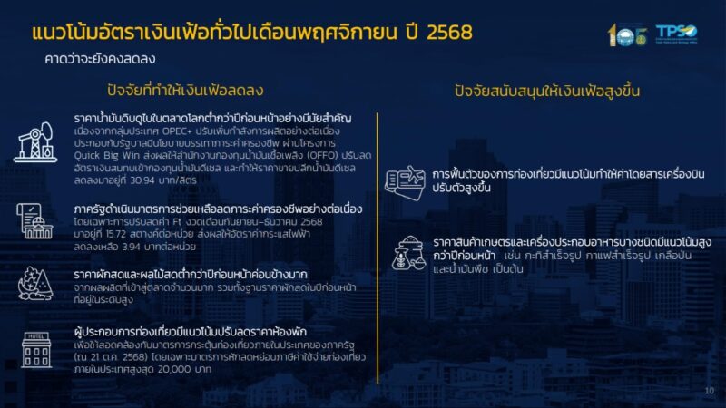 แนวโน้มอัตราเงินเฟ้อทั่วไปเดือนพฤศจิกายน 2568 คาดว่าจะยังคงลดลง โดยมีปัจจัยสนับสนุนให้อัตราเงินเฟ้อทั่วไปลดลง ได้แก่ (1) ราคาน้ำมันดิบดูไบในตลาดโลกต่ำกว่าปีก่อนหน้าอย่างมีนัยสำคัญ เนื่องจากกลุ่มประเทศโอเปกพลัสปรับเพิ่มกำลังการผลิตอย่างต่อเนื่อง ประกอบกับรัฐบาลมีนโยบายบรรเทาภาระค่าครองชีพผ่านโครงการ Quick Big Win ส่งผลให้สำนักงานกองทุนน้ำมันเชื้อเพลิง (OFFO) ปรับลดอัตราเงินสมทบเข้ากองทุนฯ และทำให้ราคาขายปลีกน้ำมันดีเซลลดลงมาอยู่ที่ 30.94 บาทต่อลิตร (2) ภาครัฐดำเนินมาตรการช่วยเหลือลดภาระค่าครองชีพอย่างต่อเนื่อง โดยเฉพาะการปรับลดค่า Ft งวดเดือนกันยายน – ธันวาคม 2568 มาอยู่ที่ 15.72 สตางค์ต่อหน่วย ส่งผลให้อัตราค่ากระแสไฟฟ้าลดลงเหลือ 3.94 บาทต่อหน่วย (3) ราคาผักสดและผลไม้สดต่ำกว่าปีก่อนหน้าค่อนข้างมาก จากผลผลิตที่เข้าสู่ตลาดจำนวนมาก รวมทั้งฐานราคาผักสดในปีก่อนหน้าที่อยู่ในระดับสูง และ (4) ผู้ประกอบการท่องเที่ยวมีแนวโน้มปรับลดราคาห้องพัก เพื่อให้สอดคล้องกับมาตรการกระตุ้นการท่องเที่ยวภายในประเทศของภาครัฐ (ณ วันที่ 21 ต.ค.2568) โดยเฉพาะมาตรการหักลดหย่อนภาษีค่าใช้จ่ายท่องเที่ยวภายในประเทศสูงสุด 20,000 บาท