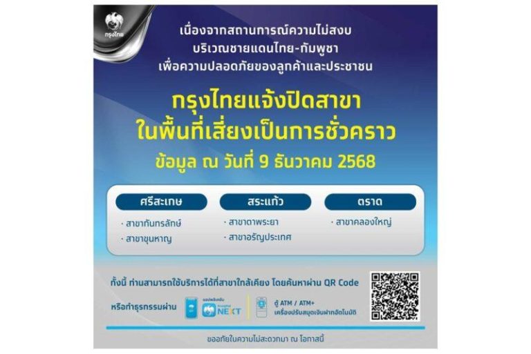 กรุงไทยปิดสาขาในพื้นที่เสี่ยง 3 จังหวัด เหตุสถานการณ์ความไม่สงบชายแดนไทย-กัมพูชา