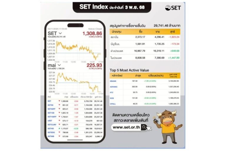 หุ้นไทยปิด 1,308.86 -0.64 มูลค่าซื้อขาย 29,741.46 ล้านบาท นักลงทุนต่างประเทศซื้อ +648.68 ล้านบาท